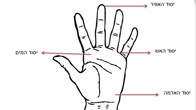 קצות האצבעות משקפות את יסוד האוויר. החיבור בין האצבעות לבסיס כף היד משקף את יסוד האש. כרית כף היד העליונה משקפת מאפיינים מיסוד המים, וכרית כף היד התחתונה משקפת מאפיינים של יסוד האדמה.