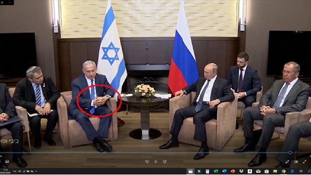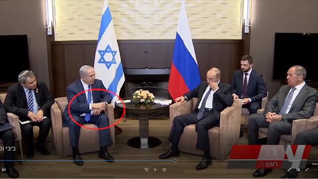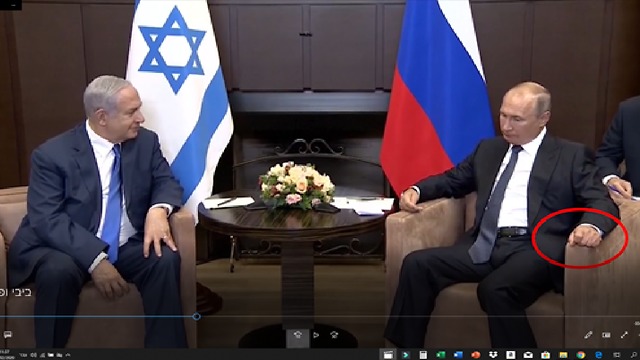 פוטין יושב כשהחזה והברכיים שלו מופנים כלפי נתניהו. הברכיים ואזור החזה מעידים על הכוונות של אותו אדם, בתור התחלה: האם הפרטנר לפגישה בכלל מעניין אותו? אולי הוא משועמם? אולי משהו אחר בחלל תופס את תשומת לבו? תנוחת הישיבה פוטין מעידה כי הוא לגמרי עם ביבי. יחד עם זאת, שימו לב שרוב הזמן הוא לא מישיר מבט אל נתניהו, מבטו מושפל והוא ממולל את אצבעות יד ימין ויד שמאל בחוסר נוחות. טונוס שרירי הידיים די גבוה, דבר שמעיד על חוסר שקט ואי נוחות.